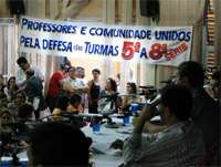 O plenário da Câmara ficou superlotado de professores municipais para a sessão de ontem à noite. Mesmo quando a reunião terminou, à 0h50, o plenário ainda estava praticamente cheio. Isso mesmo: a sessão acabou de madrugada. Os professores se mostraram divididos. Parte aplaudia a defesa da Secretaria da Educação, parte aplaudia as críticas. O Sindicato dos Servidores pediu união da categoria.