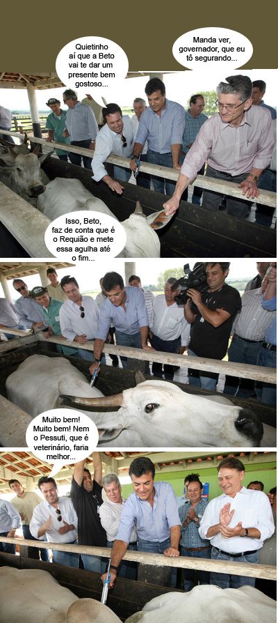 O clic é de Umuarama, onde o governador Beto Richa, lançou a campanha de vacinação contra a febre aftoso. Ele não se intimidou, não, e deu uma de veterinário. Tudo acompanhado de perto pelo presidente do Águas Paraná, o agrônomo mourãoense Márcio Nunes. O secretário de Estado Norberto Ortigara (Agricultura) é quem aparece puxando a orelha do boi. A meta no Paraná é vacinar 9 milhões de animais.