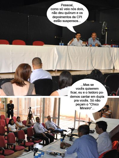 Os clics são desta quinta pela manhã, durante a reunião da CPI da Festa o Carneiro no Buraco. Como a gente tinha cantado a bola, não teve reunião. Motivo? Falta de vereadores. Apenas o presidente da comissão, Sidnei Jardim, e o relator Isidoro Moraes compareceram. Os demais tomaram doril. Sumiram! Quatro funcionários da prefeitura convocados para depor estavam por, mas foram dispensados. À tarde a CPI tenta de novo, quando estão previstos outros depoimentos. Cruzem os dedos!...