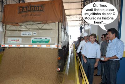Olha aí mais um clic da inauguração da ampliação e reforma do Porto Seco do Terminal da Ferroeste, em Cascavel. Foi quinta-feira, com a presença do governador Beto Richa. A obra foi feita pela Codapar, daí o motivo do presidente-mourãoense Tino Staniszewski ficar lado a lado com o governador. E repare que a primeira carreta a descarregar é da Coamo. Ah, o que é que tem puxar a sardinha pra sua brasa, né?...