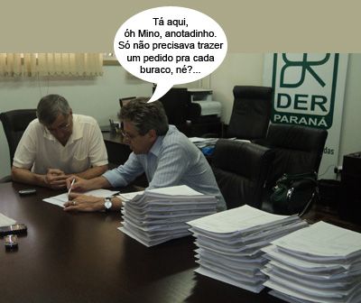 Olha aí o clic do prefeito Mino Bonato (Araruna) junto com o superintendente regional do DER, Osmar Lopes, em Maringá. Foi pra levar o pedido de uma mãozinha do governo estadual para dar jeito nos buracos que tomam conta da estrada municipal que liga as saídas de Araruna para Campo Mourão e para Peabiru. O trecho tem só 1 km, mas tá cheinho de buraco e dando uma dor de cabeça em todo mundo. E haja doril...