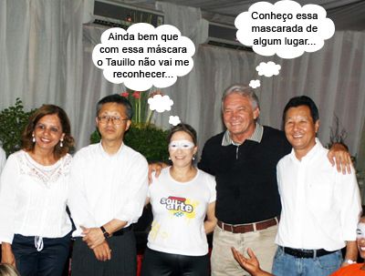 O clic é de domingo passado, em Terra Boa, durante a Festa da Costela da Terra, o prato típico do município. Estão na foto a prefeita anfitriã Vera Zanatta, o prefeito Nelson Tureck (Campo Mourão), o deputado federal Luiz Nishimori, o cônsul geral do Japão, Noboru Yamagushi, e a ex-secretária Edilaine de Castro. Isso mesmo: a “mascarada” ao lado de Tureck é a Edilaine, que estava por lá comandando o Espaço Sou Arte. Hummm...