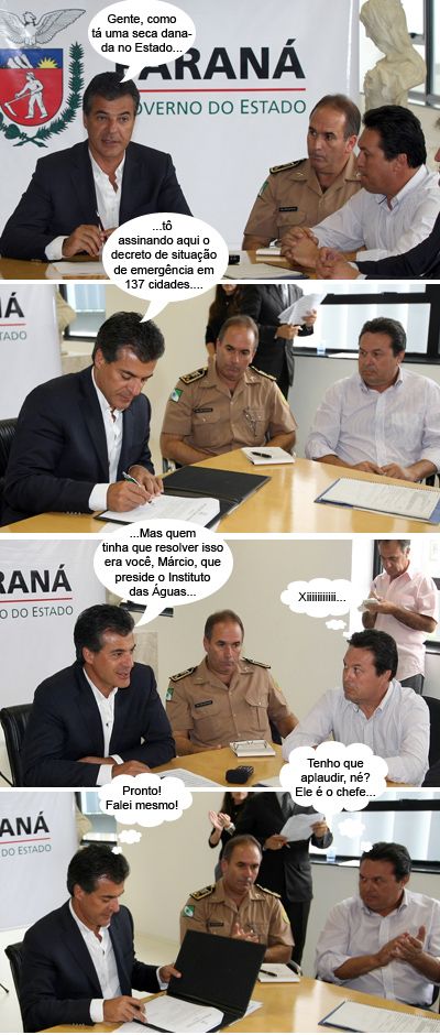 Os clics são de ontem, em Curitiba, quando o governador Beto Richa assinou o decreto de situação de emergência para 127 municípios castigados pela estiagem. Entre eles, 12 são da região. Durante o evento, o mourãoense Márcio Nunes, que presidente o Instituto das Águas, ficou pertinho do governador. É, Nunes preside, mas quem manda mesmo é São Pedro...