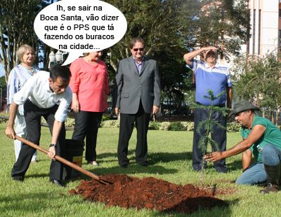 O clic é da semana passada, quando um pinheiro foi plantado na praça Getúlio Vargas para marcar os 100 anos de nascimento do ex-prefeito Roberto Brzezinski. O historiador Jair Elias dos Santos Jr ajudou a cavar o buraco para o plantio da árvore. Tudo observado pelos filhos do ex-prefeito. Como Jair Elias é assessor do vereador José Pochapski, que é do PPS, já dá pra imaginar o que os adversários vão dizer...