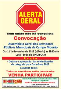 Sindiscam - O Sindicato dos Servidores Municipais de Campo Mourão realiza assembleia neste sábado (8h30). O principal assunto em discussão será a elaboração da pauta a ser levada para a prefeitura nas chamadas negociações salariais. Mês que vem é a data-base da categoria. Hummm, isso em ano eleitoral...