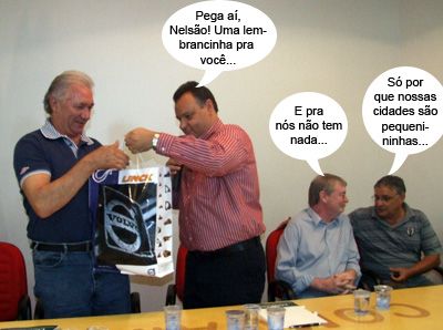 O clic é da assembleia da Comcam, na sexta-feira. Após ser reeleito, por aclamação, o presidente Fábio D’Alécio (Ubiratã) distribuiu uma lembrancinha aos colegas. Olha aí o prefeito Nelson Tureck recebendo a dele. Ao lado estão os prefeitos João Carlos Klein (Peabiru) e Toinzé Piazzalunga (Iretama). Todos receberam a sacola. Em tempo: dentro delas, apenas brindes que D’Alécio ganhou, como bonés, canetas e coisas afins.