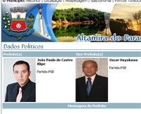 Altamira do Paraná tá de prefeito novo, eleito de forma indireta pela Câmara, depois da cassação do prefeito eleito em 2008. Só que no site oficial do município não tem essa informação, não. Lá continua saindo que o prefeito é João Paulo Klipe e o vice é Oscar Hayakawa. Com foto e tudo. Nada de Juquinha Amaro e Zé da Copel. Estes ainda aparecem como vereadores no site da Acamdoze. Ah, pra que pressa, né?...