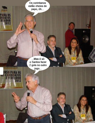 ENQUANTO ISSO, NO AQUECIMENTO DO CLÁSSICO... Os cliques são da semana passada, durante evento do PPS em Campo Mourão. O deputado federal Rubens Bueno, presidente estadual da sigla, participou. O deputado estadual Douglas Fabrício também. Em dia decisivo para Corinthians e Santos, vale lembrar que Douglas é santista. Bueno se apresentava como santista quando era prefeito de Campo Mourão. Agora prefere dizer que é atleticano, mas ainda deve restar um pontinha santista. No mais, o TRE não pude infidelidade clubística...