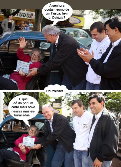 ENQUANTO ISSO, NO DIA MUNICIPAL DO FUSCA... Os cliques são do 9º Encontro Mourãoense do Fusca, que aconteceu ontem na praça São José. A pioneira Delézia Slomp, 93, foi homenageada. Ela tem um “VW Sedan” 84 que tirou 0 km. São 28 anos dirigindo o mesmo carro. E dona Delézia dirige mesmo. Sua CNH foi renovada e vale até 2015. Também estão nas fotos o prefeito Nelson Tureck, o presidente do Clube do Fusca, Maurício Pozza, e o vereador Sidnei Jardim. E viva o Fusca!...