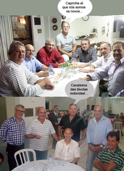 Os cliques são do final de semana dos pré-candidatos a prefeitos de Campo Mourão. Na sexta-feira, o Luiz Alfredo (PT do B) promoveu um jantar em casa, tendo como convidados, entre outros, José Turozi (PV), Nery Thomé (DEM) e Osni Menezes (PSC). No sábado foi a vez do PMDB promover jantar para lançar seus pré-candidatos, tendo à frente o pré-prefeitável pelo partido, o vereador Eraldo Teodoro. E reparou? Todo mundo em távolas, ops, mesas redondas...