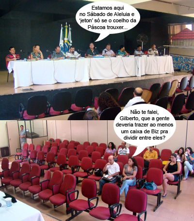 Os cliques são de ontem pela manhã, quando em pleno sábado de aleluia os vereadores de Campo Mourão se reuniram em sessão extraordinária. Tudo pra votar o reajuste dos servidores municipais. Ontem passou. A votação em segundo turno será neste domingo de Páscoa (9h). Na sessão de sábado, apenas José Pochapski faltou. Entre o público presente, os sindicalistas Zulmeia da Silva e Gilberto Santana de Alencar. Viu só, e você achando que é fácil...
