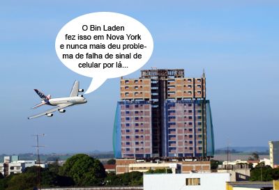 ENQUANTO ISSO, PELOS ARES MOURÃOENSES... Calma, que o clic de hoje é só uma montagem.Se bem que foi isso que muita gente teve vontade de fazer quando a Tim disse que a culpa pelas falha no sinal eram de um prédio em construção no centro da cidade. Tudo já resolvido, garante a operadora. Sem precisar derrubar o prédio! Ufa! Melhor assim. Ainda mais agora que até o aeroporto de Campo Mourão foi interditado para pousos e decolagens...