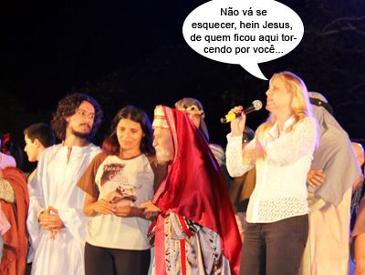 ENQUANTO ISSO, NO AUTO DA PAIXÃO DE CRISTO... O clic é do encerramento do Auto da Paixão de Cristo, sexta-feira, quando a vice-prefeita Regina Dubay foi chamada para discursar, já que o prefeito Nelson Tureck não estava por lá. Ao lado dela, estão os atores Paulo Henrique da Silva (Jesus) e Francisco Hernandes (Caifás), além da diretora Vanuza Eloísa. No mais, se o prefeito quiser faltar a mais eventos com grande público, a vice não reclama, não...