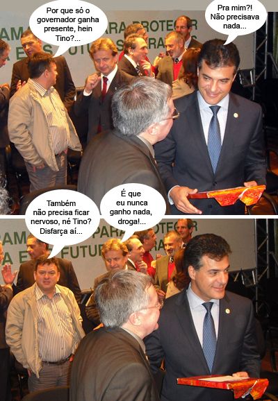 Os cliques são de Curitiba, onde aconteceu terça-feira à noite o lançamento do programa Bioclima Paraná. O governador Beto Richa participou do evento. O presidente do Ipáguas, Márcio Nunes também. Isso sem contar o chefe regional do IAP, Paulo Tanahaki, e o presidente da Codapar, Tino Staniszewski, que está ali atrás do governador. Mas presentinho que é bom, só pro chefão mesmo...