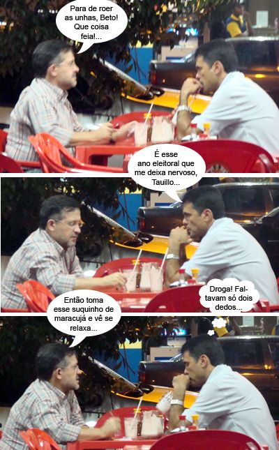 ENQUANTO ISSO, NUMA LANCHONETE DA CIDADE... Os cliques são de segunda-feira à noite, após a sessão da Câmara, quando o ex-prefeito Tauillo Tezelli e o vereador Beto Voidelo, ambos do PPS, colocaram a conversa em dia numa lanchonete da cidade. O assunto principal, é claro, a sucessão municipal. Voidelo diz que não quer a reeleição de vereador, mas, de repente, quem sabe, numa dessas, não descarta uma candidatura a vice-prefeito. Hummmmm...