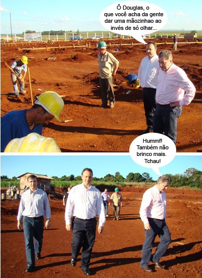 ENQUANTO ISSO, NA VISTORIA EM UBIRATÃ... Os cliques são de Ubiratã, onde o deputado Douglas Fabrício, o prefeito Fábio D’Alécio e o vice-prefeito Orladinho Vieira Filho foram dar uma olhadas nas obras da escola do jardim São Paulo. O presidente da Câmara, Sebastião Beraldo, também estava por lá. Entre construção e equipamentos, a nova escola vai custar R$ 3 milhões. Tudo bancado pelo governo do Estado. E viva o governo!...