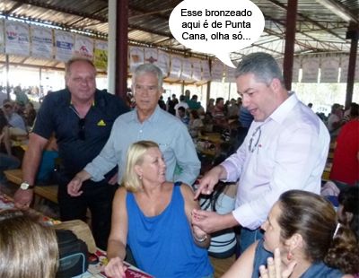 O clic é de domingo, no Costelão de São José, e mostra o deputado estadual Douglas Fabrício, o federal Rubens Bueno e a esposa dele, Rose, além do presidente local de DEM, Cezar Bronzel, e a professor Isabel Battilani. Bueno e Rose estiveram há poucos dias na República Dominicana, onde a filha, a vereadora curitibana Renata Bueno, se casou. Ah, casamento de socialista não teria que ser em Cuba?...