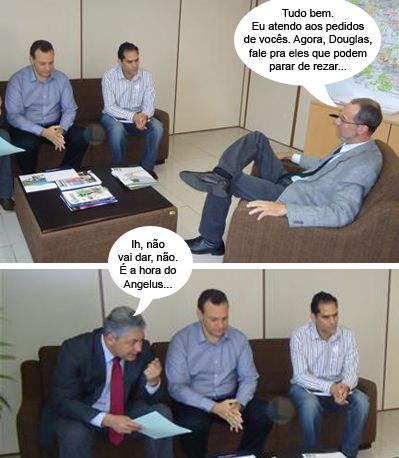 O deputado Douglas Fabrício e o presidente da Comcam, Fábio D’Alécio (Ubiratã), estiveram terça-feira no Detran, em Curitiba. Diversas reivindicações foram apresentadas e debatidas com o diretor geral da instituição, Marcos Traad. O chefe de gabinete da prefeitura ubiratanense também participou do encontro. Mas que tanto rezam, hein?...