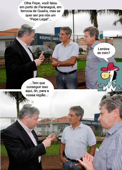 O clic é de quarta-feira, em frente a Santa Casa de Campo Mourão. Depois de se reunir com prefeitos na Comcam, o secretário de Estado Pepe Richa (Infraestrutura e Logística) foi com o deputado Douglas Fabrício ver o acesso ao hospital. O projeto que prevê melhorias nesse trecho da estrada foi licitado e tudo, mas o governo anterior alegou falta de recursos e não assinou a ordem de serviço. Ficou para o novo governador. Ah, vai que o Pepe é como o xará do desenho animado, o Pepe Legal, né?...