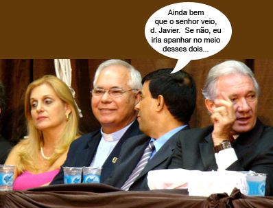 Olha aí um clic da semana passada, num dos dias da formatura da Fecilcam, quando o vereador Sidnei Jardim, representando a Câmara, ficou sentado entre a vice-prefeita Regina Dubay e o prefeito Nelson Tureck. Ao lado dele, o bispo d. Javier Paredes. Ufa!