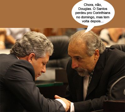 ENQUANTO ISSO, NA ASSEMBLEIA LEGISLATIVA... O clic é de segunda-feira, durante sessão da Assembleia Legislativa, e mostra uma conversa reservada no plenário entre os deputados Douglas Fabrício e Rasca Rodrigues. Este último foi secretário do Meio Ambiente no governo Requião. Só não pergunte por que o mourãoense aparece com essa expressão de abatimento. Será que foi pela derrota dos “meninos da Vila” na véspera?...