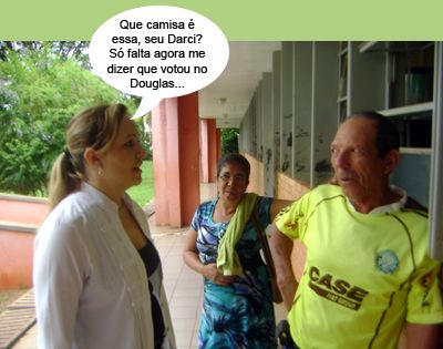 ENQUANTO ISSO, NO CENTRO DE CONVIVÊNCIA DO IDOSO.. O clic é de ontem, no Centro de Convivência do Idoso, onde a deputada Marla Tureck esteve fazendo uma visitinha básica. Acabou encontrando por lá o palmeirense Darci Carriel. Detalhe: Marla é corintiana. Talvez isso explique a cara de espanto do eleitor. E viva a democracia!...