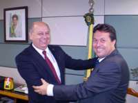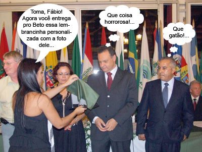 Olha só quem se encontrou ontem em Brasília, o secretário de Desenvolvimento Agropecuário do Ministério da Agricultura, Erikson Chandoha, e o presidente do Instituto das Águas, Márcio Nunes. Tudo sob o olhar da presidente Dilma Rousseff, que aparece num quadro com a faixa presidencial e tudo. Chandoha é do governo do PT e Nunes do governo do PSDB. Ah, o “mourãoensismo” fala mais alto...