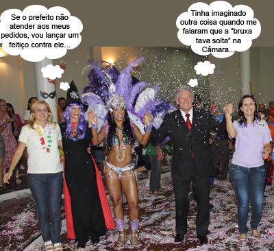 ENQUANTO ISSO, NO CARNAVAL DA 3ª IDADE... O clic é do Carnaval dos grupos da terceira idade de Campo Mourão, que foi organizado ontem pela Fecam. Mas de 400 pessoas, de 15 grupos, participaram. Foi no Clube 10 de Outubro, com animação da Banda Municipal. Na foto, estão a vice-prefeita Regina Dubay, a vereadora Nelita Piacentini (fantasiada de bruxa), a rainha do carnaval, o prefeito Nelson Tureck e a secretária Karla Tureck (Esportes). Viu, folia só fora da prefeitura...