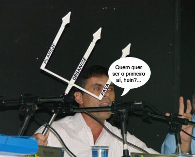 O vereador Beto Voidelo surpreendeu todo mundo na sessão de ontem à noite ao aparecer com um tridente na Câmara. Durante a sessão, ele explicou que era uma “ferramenta simbólica”, que sua missão é cutucar o executivo. E ainda mandou escrever “planeje, organize e faça” em cada um dos dentes do “instrumento”. Deuzolivre!...