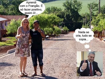 ENQUANTO ISSO, NO BAIRRO E NA ASSEMBLEIA... O gesto do deputado federal Hermes Frangão, que sempre faz um positivo na hora de ser fotografado, parece que está virando moda. Durante a semana, a vice-prefeita Regina Dubay foi conferir a pavimentação do conjunto São Francisco de Assis e fez o positivo ao lado do presidente do bairro, Luís de Jesus. O deputado Douglas Fabrício também apareceu com o polegar pra cima em foto na matéria sobre a mudança de gabinete na Assembleia Legislativa. Ih, só falta o Frangão cobrar direitos autorais...