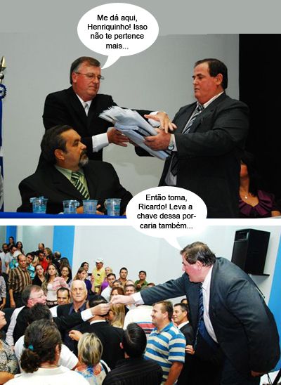 Olha aí mais clics da solenidade de posse do novo prefeito de Mamborê, Ricardo Radomski. Na primeira, Radomski pega as contas entregues pelo agora ex-prefeito Henrique Sanches Salla. Tudo observado pelo presidente da Câmara, Dirlei “Buda” Pereira. Na segunda foto, Henriquinho entrega a chave da prefeitura a Radomski, que parece que estava indo embora sem levá-la. Ah, também, com tantas emoções num dia só...