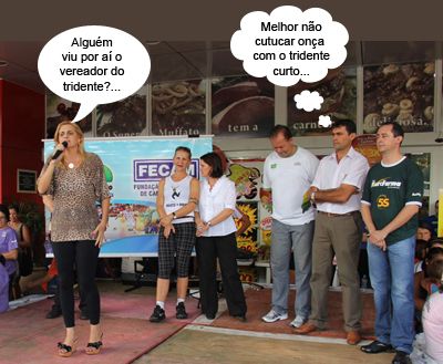 O clic é ainda do evento realizado pela prefeitura em comemoração ao Dia da Mulher, que aconteceu no final do mês passado. A vice-prefeita Regina Dubay discursa com sua tradicional roupa de oncinha. Ao fundo, entre os presentes, a vereadora Nelita Piacentini e o vereador Beto Voidelo. Detalhe: Voidelo não levou o tridente que criou para cutucar a administração.