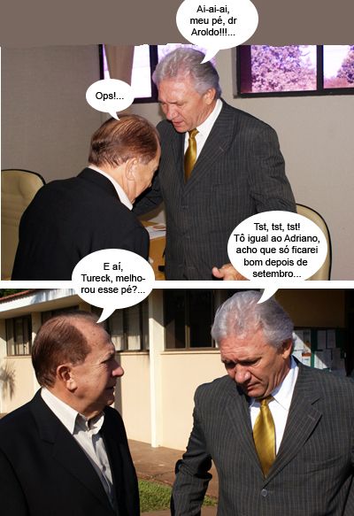 Os clics são de ontem, no 11º BPM, onde o prefeito Nelson Tureck e o presidente da Coamo, Aroldo Gallassini, se encontram durante a solenidade de formatura de 21 novos soldados. Gallassini foi o padrinho a turma, com direito a homenagem e tudo. Prefeito e líder cooperativista aproveitaram pra colocar a conversa em dia. Só não pergunte que cara é esse de dor que Tureck tá fazendo. Vá saber...