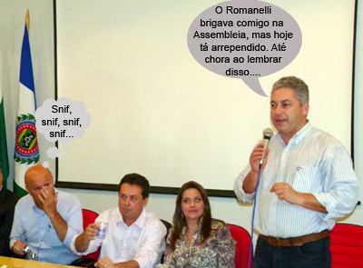 Olha aí mais um clic da posse oficial de Fátima Nunes como chefe do Núcleo Regional da Secretaria do Trabalho. Ela aparece ao centro da mesa, ao lado do presidente do Instituto das Águas, Márcio Nunes, que é marido dela. À direita o deputado Douglas Fabrício discursa, enquanto que, à esquerda, está o secretário de Estado Luiz Cláudio Romanelli (Trabalho). Mas não precisava se emocionar tanto, né?...