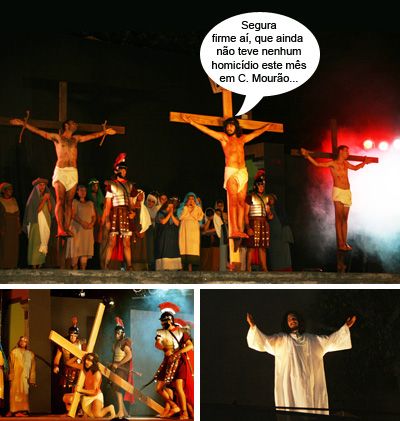 Os clics são do Auto da Paixão de Cristo, encenado ontem à noite em Campo Mourão. Pela primeira vez, o papel de Jesus Cristo ficou com o músico e ator Paulo Henrique da Silva. A direção foi de Carlos Soares (também pela primeira vez nesse espetáculo), com Vanuza Eloíza de assistente. A promoção da Fundação Cultural levou um bom público à praça São José. Quem não viu tem uma segunda chance hoje (20h) no Teatro Municipal. Será a primeira vez que a “Paixão de Cristo” irá ao teatro.