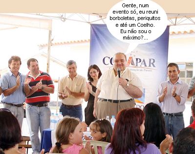 Desta vez o presidente da Cohapar, Rafael Greca, compareceu, sim! Olha ele aí, discursando durante a entrega de 64 casas populares em Araruna. Foi ontem à tarde. Repare que ao fundo, à esquerda, o ex-prefeito periquito Fabiano Antoniassi está ao ladinho do prefeito borboleta Mino Bonato. Também aparecem no clic o gerente regional da Cohapar, Paulo “Coelho” Sovinski; a gerente da Caixa, Célia Furlanetto; e o vice-prefeito e ex-prefeito borboleta Renato Toaldo. E viva Araruna e seus bichos!...
