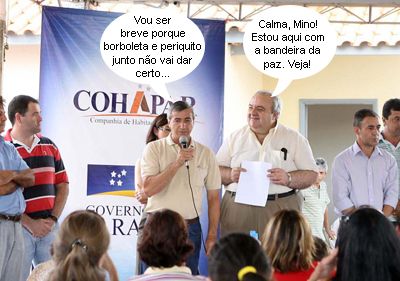 Olha aí mais um clic da inauguração das 64 casas populares, anteontem, em Araruna, com direito à presença do presidente da Cohapar, Rafael Greca. Desta vez quem aparece discursando é o prefeito-borboleta Mino Bonato. À esquerda, quem observa fixamente é o ex-prefeito-periquito Fabiano Antoniassi. Já à direita, o ex-prefeito-borboleta e atual vice-prefeito Renato Toaldo prefere nem olhar pro lado dos periquitos. Eita Araruna!...