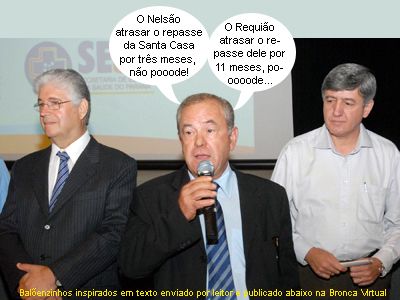 O clic é da Escola de Governo, ontem, quando o governador Roberto Requião assinou a liberação de R$ 5,3 milhões para a Santa Casa de Campo Mourão. O dinheiro será para a construção do pronto socorro, ampliação da maternidade (R$ 2,9 milhões) e aquisição dos equipamentos (R$ 2,4 milhões). O presidente da Santa Casa, Elmo Linhares, teve direito a discurso ao lado do governador e do secretário da Saúde, Gilberto Martin. Ah, assim não dá pra criticar os homens, gente!...