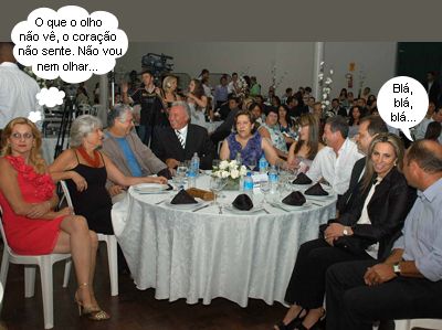 A gente abriu um pouco mais o clic de ontem e olha só o que apareceu. A vice-prefeita Regina Dubay com cara de poucos amigos enquanto o marido Laércio Dubay, do outro lado da mesa, conversa com a deputada Cida Borghetti. Foi no jantar dos 40 anos da Comcam, na hora da exibição do vídeo no telão. Ao fundo, o prefeito Nelson Tureck e o governador Roberto Requião riem sem parar. Vá ver era alguma piadinha machista, porque as mulheres não estão achando graça, não...