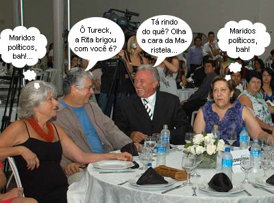 O clic é do jantar em comemoração aos 40 anos da Comcam. Antes da formação da mesa principal, o governador Roberto Requião e o prefeito Nelson Tureck trocaram gargalhadas. Seja lá o que foi que gerou tantas risadas, parece que as primeiras-damas não acharam muita graça. Tanto Maristela Requião quanto Rita Tureck estão bem sérias na mesa. Ah, deve ser que político ri à toa...
