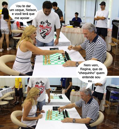 Os clics são do Sesc, ontem, na abertura do Campeonato Paranaense de Xadrez. O prefeito Nelson Tureck e a vice-prefeita Regina Dubay foram prestigiar o evento e aproveitaram para uma partidinha. Na verdade, pura encenação para as fotos, a pedido da imprensa. Até por que, xeque por xeque, a prefeitura quer mesmo é cheque pra tocar a obraiada...