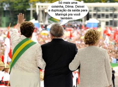 Olha aí mais um clic da cerimônia de posse da presidenta Dilma Rousseff, anteontem. Após receber a faixa presidencial, ela acena para o público ao lado do ex-presidente Lula e da ex-primeira-dama, dona Marisa. Assim como a pavimentação da Estrada Boiadiera, o sonho mourãoense de ver duplicada o trecho urbano da saída para Maringá (BR 158) também ficou para a nova presidenta. É, ano ano, governo novo, sonhos antiiiiiiigos...