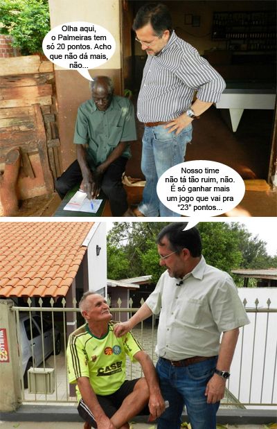 ENQUANTO ISSO, NA CAMPANHA ELEITORAL.. Os cliques foram retirados do Facebook de campanha do prefeitável Tauillo Tezelli. Eles mostram o candidato em visitas por bairros da cidade. Numa das fotos, o eleitor está com a camisa do Palmeiras, que também é o time de coração de Tauillo. Se bem que, cá pra nós. Do jeito que o Verdão vai no Brasileirão, melhor mudar de assunto...