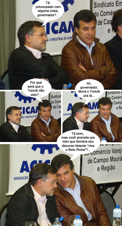 A história da Acicam ter ido entregar uma lista de pedidos ao governador Beto Richa e acabar presa a um evento que era um comício pró-Tauillo Tezelli, foi o assunto do dia nas rodas polícias deste sexta-feira. Pudera. A associação comercial ficou numa saia justa nada. Ontem à tarde, a Acicam divulgou nota pra dizer que foi lá só pra entregar os pedidos ao governador. Mais nada. Ih, mas vá convencer os outros candidatos, vá!...