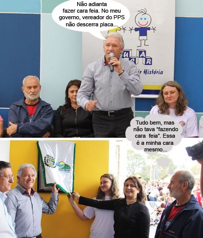 Os cliques são da inauguração da reforma e ampliação da creche Nossa Senhora de Fátima no jardim Paulino. O prefeito Nelson Tureck aparece discursando e descerrando a placa, ao lado da secretária Rita Cartelli de Oliveira (Educação). O vereador e ex-prefeito José Pochapski, que é da oposição, assiste a tudo bem quietinho. Deuzolivre!..