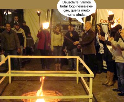 O clic é deste sábado à noite, no Parque de Exposições, durante o acendimento do “buraco número 1” da Festa Nacional do Carneiro no Buraco. Tudo por conta do prefeito Nelson Tureck. De políticos, também estiveram por lá a deputada-filha Marla Tureck, o presidente da Câmara, Eraldo Teodoro, e a vereadora Nelita Piacentini. No domingo tem mais político no buraco, para a retirada do tacho. Pensa que é fácil, é?...
