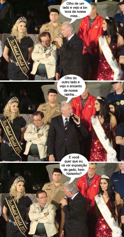 Os cliques são de ontem à noite, no Parque de Exposições de Campo Mourão, onde aconteceu a solenidade de abertura oficial da 22ª Festa Nacional do Carneiro no Buraco. O prefeito Nelson Tureck teve o privilégio de ficar entre a miss Campo Mourão, Glória Maria Rossi, e a rainha da festa, Alessandra Souza. No final do evento, a convite de Tureck, o presidente do Sindicato Rural, Nelsinho Teodoro, também ficou ao lado das beldades.