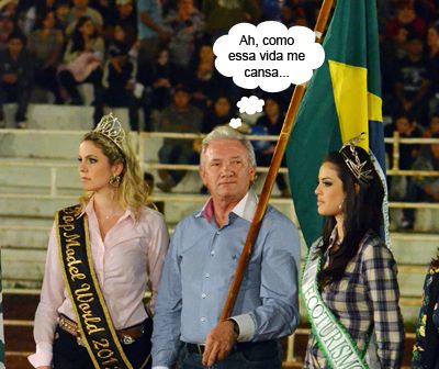 ENQUANTO ISSO, NA ABERTURA DO RODEIO... O clic é de quarta-feira, no segundo dia da 22ª Festa Nacional do Carneiro no Buraco, o primeiro com rodeio. E se no primeiro o prefeito Nelson Tureck fez a abertura do evento ladeado pela miss Campo Mourão e pela rainha da festa, no segundo, foi a vez da abertura do rodeio. E lá foi Tureck discursar, de novo, agora ao lado de mais duas beldades. Ah, pensa que é fácil, é?...