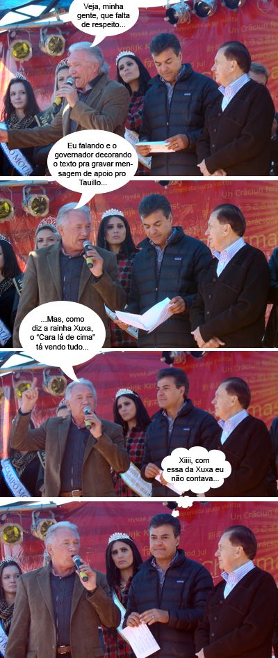 ENQUANTO ISSO, AINDA NA FESTA DO CARNEIRO... Olha mais cliques da presença do governador Beto Richa na 22ª Festa Nacional do Carneiro no Buraco, no último dia 8. O prefeito Nelson Tureck aparece discursando enquanto Richa lê alguma coisa (provavelmente informações para o discurso que faria em seguida). O presidente da Coamo, Aroldo Gallassini, aparece ao lado e a rainha da festa ao fundo.