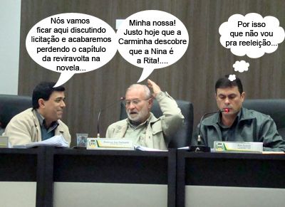 ENQUANTO ISSO, NA SESSÃO DA CÂMARA... O clic é de ontem à noite, durante sessão extraordinária da Câmara de Campo Mourão que votou a lei da concessão para o transporte coletivo urbano. A bancada do PPS tentou, mas não conseguiu adiar a votação. Depois disso, os vereadores Sidnei Jardim, José Pochapski e Beto Voidelo passaram o resto da reunião nos cochichos. Ah, devia ser sobre a Carminha da novela. Só pode...